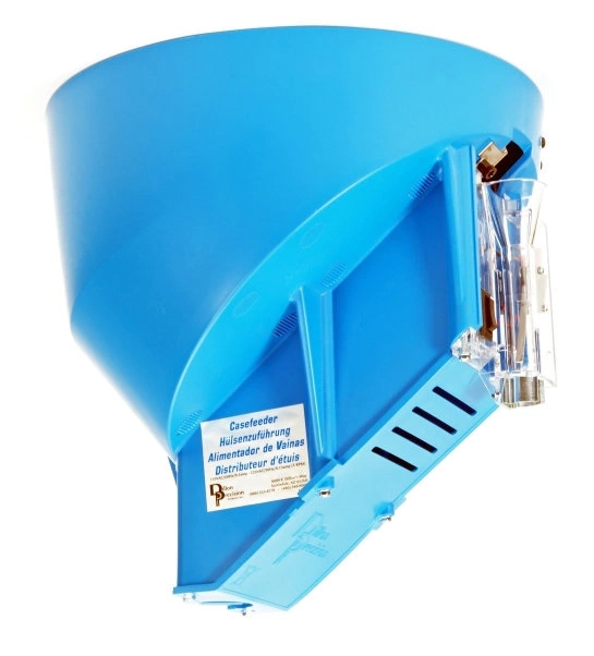 Alimentador eléctrico de velocidad variable para las máquinas XL650. Con él, simplemente arrojas las vainas y lo enciendes. Orienta automáticamente la vaina con la boca hacia arriba, llena el tubo de alimentación, se cierra cuando el tubo está lleno y se inicia automáticamente cuando el tubo baja. La velocidad del alimentador de vainas se controla mediante un potenciómetro en el embudo de alimentador. Le permite regular infinitamente la velocidad de 0 a 8 RPM. El motor presenta una fuente de alimentación universal para voltajes domésticos y extranjeros. Adaptable a 110 o 220 voltios, 60 o 50 hz, simplemente cambia el enchufe al estilo apropiado para tu región.